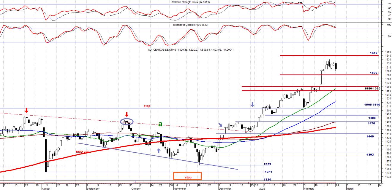 Η ελληνική χρηματαγορά δείχνει σαν να έχει κορυφώσει στην τρέχουσα φάση της. Η περιοχή των 1630-1640 μονάδων έχει αποδειχθεί αρκετά δυνατή σαν αντίσταση και μένει τώρα να δούμε αν η περιοχή των 1590-1600 μονάδων θα λειτουργήσει επίσης σαν μια δυνατή στήριξη όπως μπορούμε να δούμε στο παρακάτω...