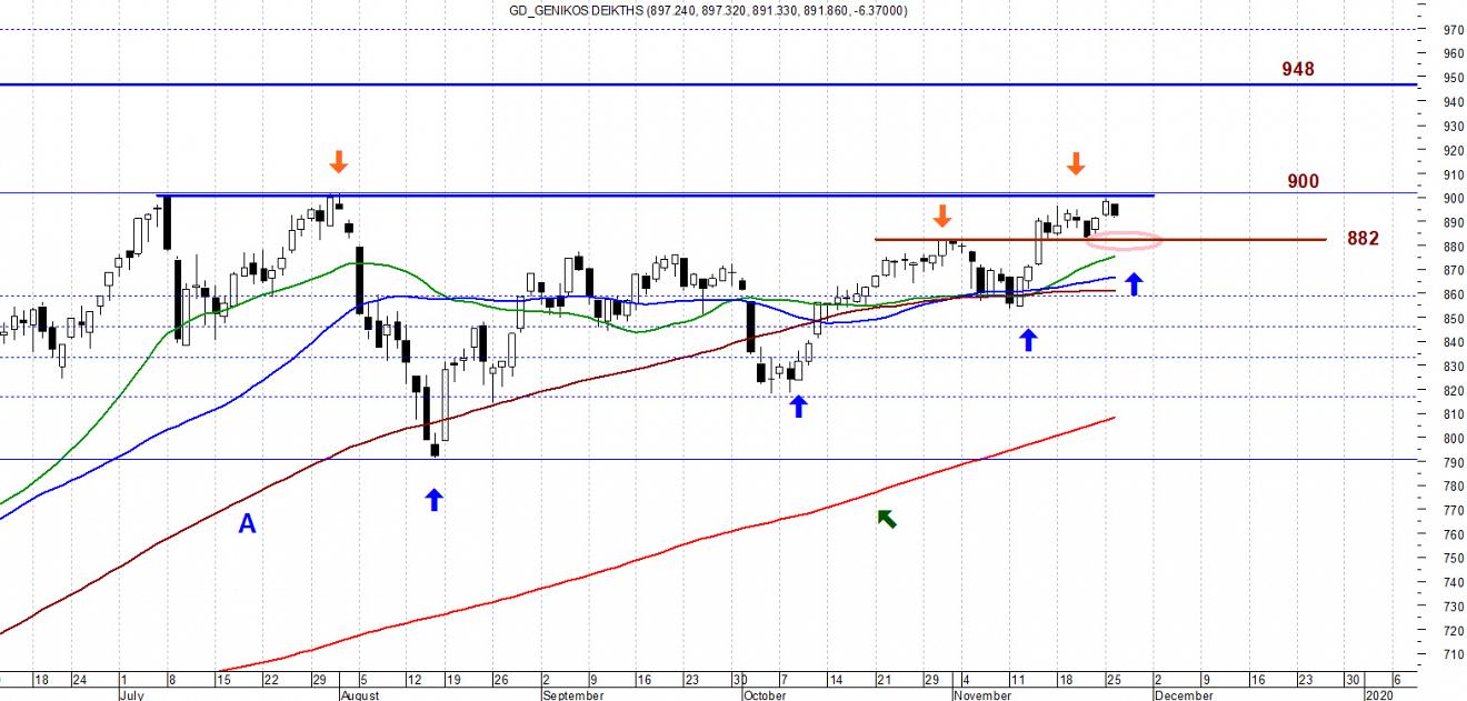 Διατηρούμε το βραχυπρόθεσμο sell-stop στις 882 μονάδες και το μεσοπρόθεσμο στις 854 μονάδες.