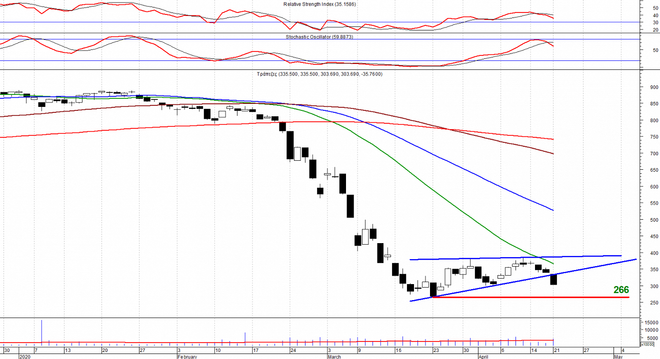 Κανένα αγοραστικό σήμα για την ώρα, με το βραχυπρόθεσμο sell-stop στις 299 μονάδες, με το αμέσως επόμενο στις 266 μονάδες, όπως εξάλλου φαίνεται και στο παραπάνω γράφημα..