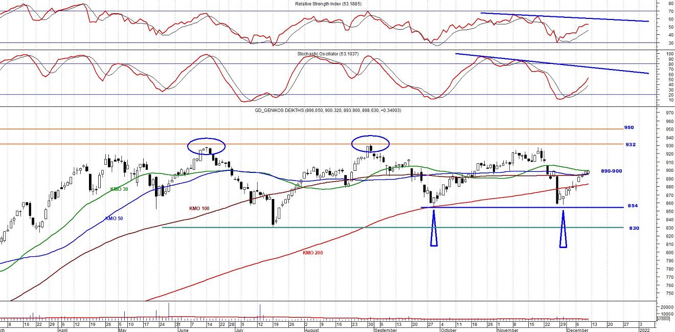 Τεχνικά, ο ΓΔ επιχειρεί ξανά να εισέλθει στη ζώνη πάνω από τις 900 μονάδες, περνώντας ανοδικά πάνω από τους ΚΜΟ50-100 ημερών και φλερτάρει έντονα με τον ΚΜΟ30 ημερών στις 899 μονάδες. Η ανοδική διάσπαση αυτών των 3 κινητών μέσων, θα μπορούσε να δώσει πνοή στο ελληνικό χρηματιστήριο, θέτοντας ξανά επί τάπητος των πρώτο στόχο των 930 μονάδων.