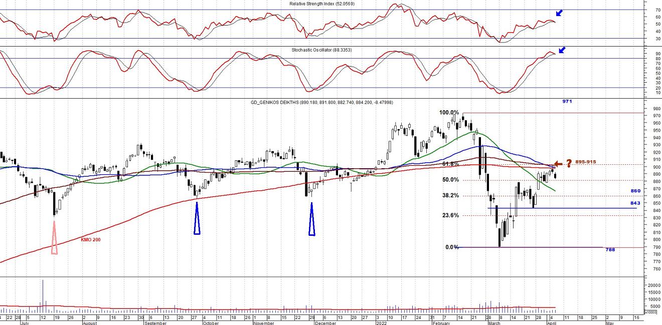 Ο ΓΔ με την αντιδραστική κίνηση που έκανε τον προηγούμενο μήνα κατάφερε να φτάσει έως το όριο της επιβεβαίωσης της πτωτικής τάσης. Όπως έχουμε αναφέρει ξανά, η κρίσιμη ζώνη αντίστασης μεταξύ των 895 και 915 μονάδων, πρέπει να διασπαστεί ανοδικά, καθώς μόνο έτσι θα αποκτήσει ο ΓΔ ανοδική ορμή και θα καταφέρει να αναιρέσει την μεσοπρόθεσμη πτωτική τάση στην οποία έχει εισέλθει.