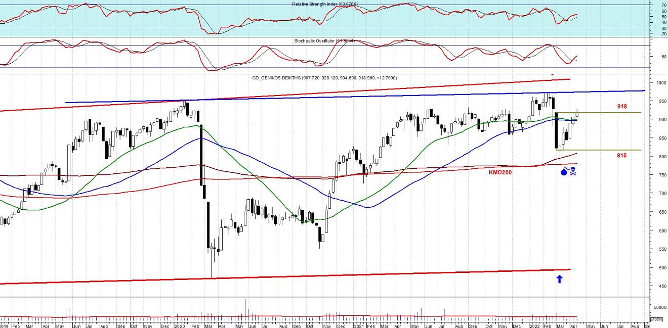 Στο πολύ καλό σενάριο αλλά ταυτόχρονα και στο δυσκολότερο, ο ΓΔ "τρώει" ανοδικά το μεγάλο μαύρο κερί που φαίνεται στο πρώτο εβδομαδιαίο γράφημα, παραμένοντας πάνω από τις 918 μονάδες σε ημερήσια κλεισίματα και συνεχίζει για υψηλότερα νούμερα..