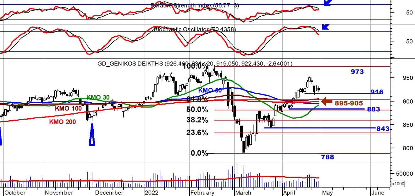 Διατηρούμε το βραχυπρόθεσμο stop στις 916 μονάδες και το μεσοπρόθεσμο στις 883 μονάδες.