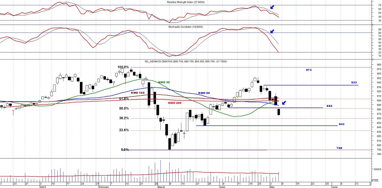 Επόμενο κοντινό όριο στήριξης η περιοχή των 843 μονάδων, η οποία αν δεν κρατήσει οδηγούμαστε αυτόματα προς τα χαμηλά του Φεβρουαρίου, πέριξ των 790 μονάδων.