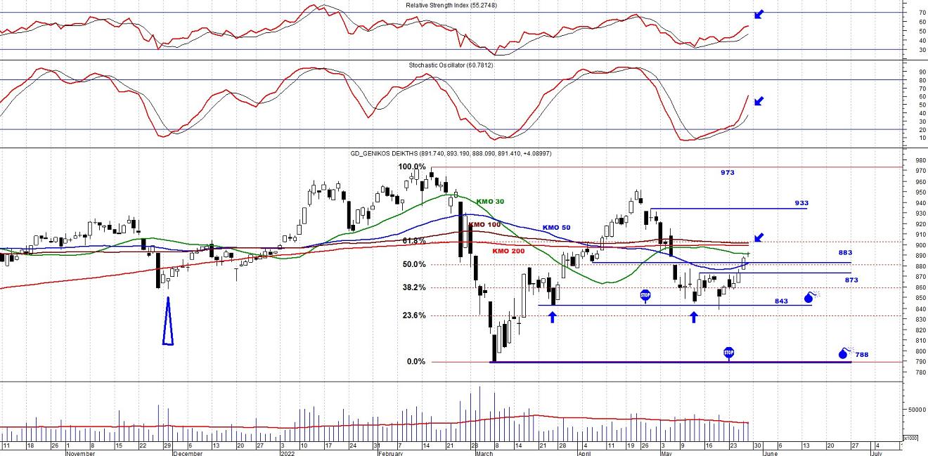 Για την ώρα και για τους γρήγορους, θα έχουμε βραχυπρόθεσμο αγοραστικό σήμα, αν και μόνο αν, πραγματοποιηθεί η ανοδική υπέρβαση των 900 μονάδων.