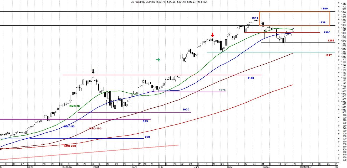 Στρατηγικό επίπεδο στην παρούσα φάση, αποτελούν οι 1328 μονάδες και η επανείσοδος του δείκτη εντός της δύσκολης ζώνης 1328-1380. Εάν αυτό καταφέρουμε να το επιτύχουμε εντός των επόμενων 2-3 ημερών, οι πιθανότητες για συνέχιση της ανοδικής κίνησης θα έχουν αυξηθεί σημαντικά.
