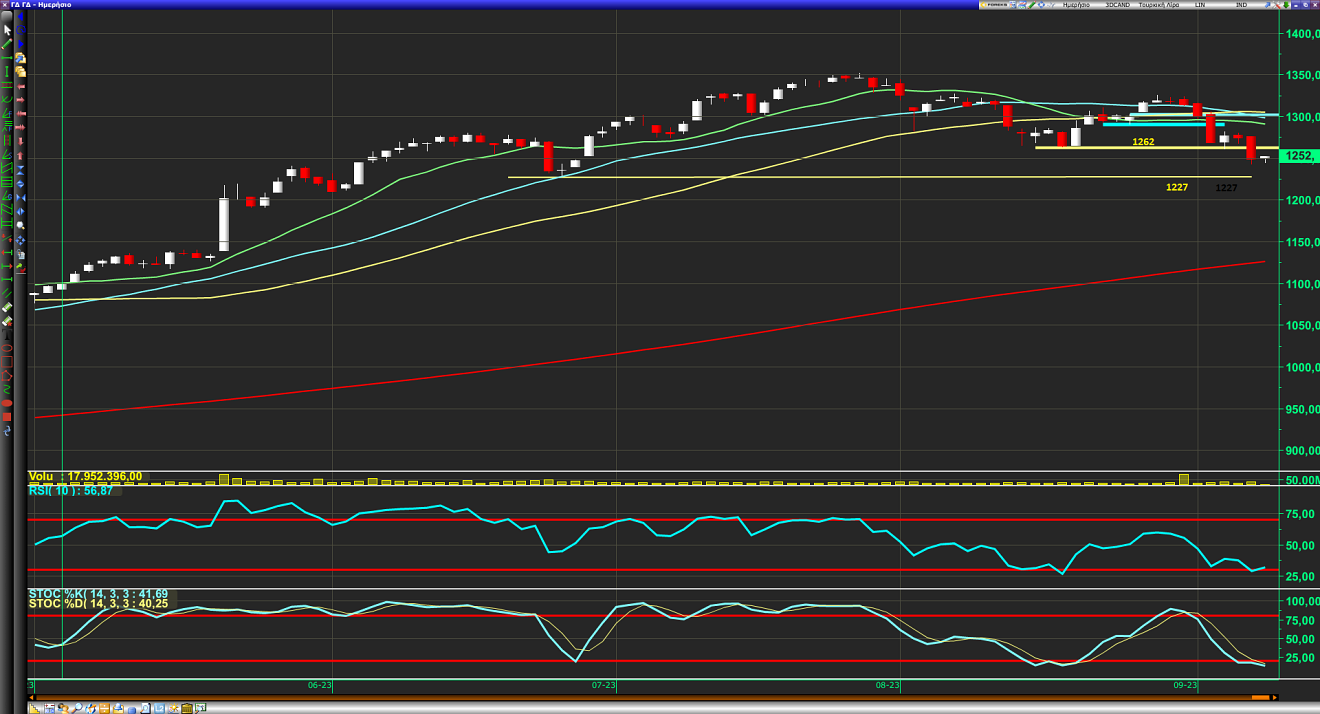 Ο ΓΔ με ευκολία διέσπασε πτωτικά τις 1262 μονάδες και κατευθύνεται πλέον προς τις 1227 μονάδες. Όπως επισημάνθηκε και στο προηγούμενο σχόλιο αγοράς, κάτω από αυτό το όριο έχουμε αλλαγή της ανοδικής τάσης σε μεσοπρόθεσμα πτωτική.