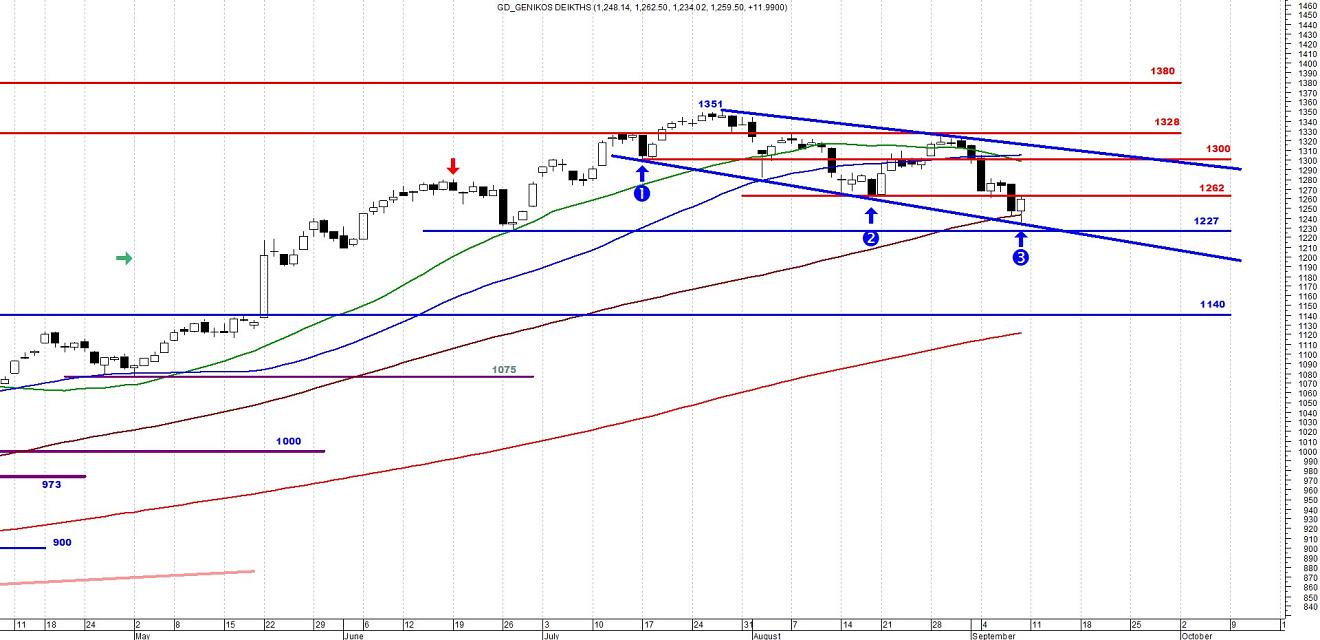 Αν ο ΓΔ χάσει τα χαμηλά αυτά και ειδικότερα τις 1227 μονάδες, τότε θα ανοίξει ο δρόμος για την περιοχή της μεγάλης στήριξης των 1140 μονάδων.