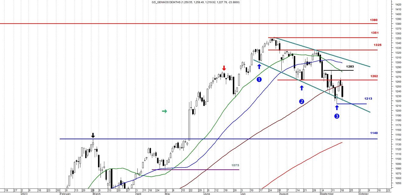 Στην εξέλιξη της πτωτικής κίνησης, πιθανότερο σενάριο για τη συνέχεια θα βλέπαμε τη συνέχιση της πτώσης προς τα επίπεδα των 1140 μονάδων. Ένα σενάριο το οποίο δεν το θέλουμε, γιατί στα επίπεδα αυτά ο ΓΔ θα αναμετρηθεί με τον ΚΜΟ-200 ημερών, κάτι που μπορεί να αλλάξει την μακροπρόθεσμη τάση σε όλη την αγορά.