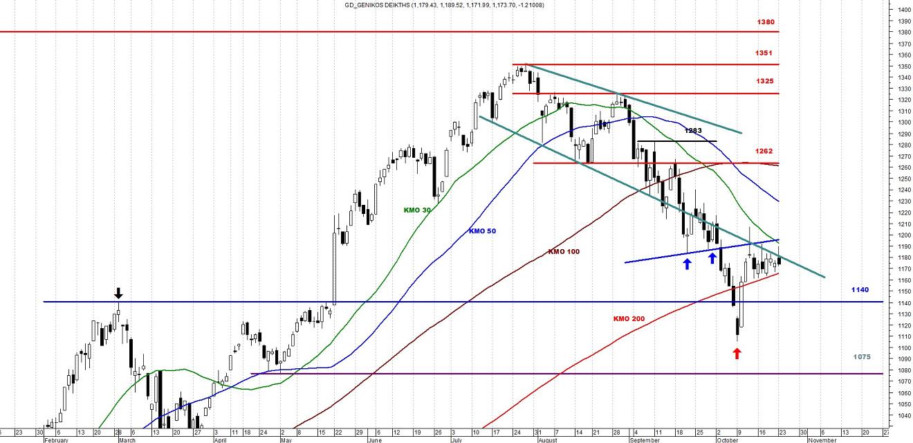 Ο ΓΔ τις τελευταίες εβδομάδες προσπαθεί να πετύχει την ανοδική υπέρβαση των 1200-1220 μονάδων, καθώς αυτό θα αποτελέσει το κλειδί για το ξεκλείδωμα της μεσοπρόθεσμης ανοδικής τάσης ξανά.
