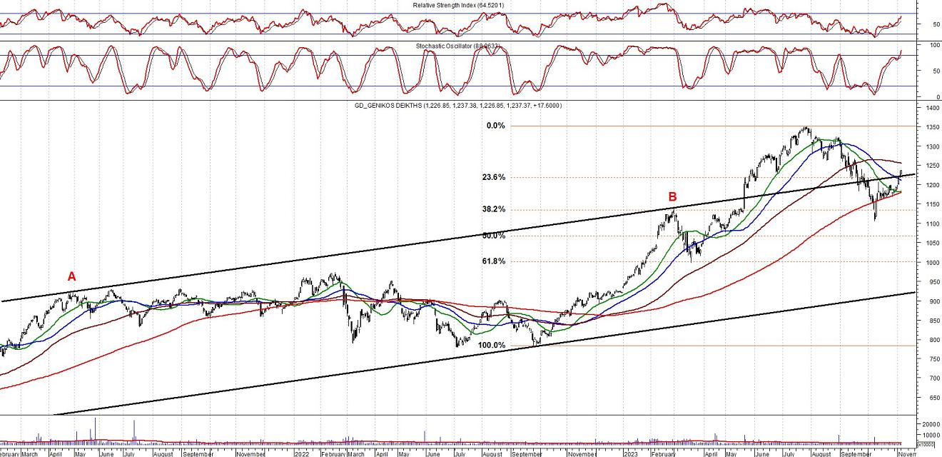 Η προσπάθεια ανόδου του ΓΔ ξανά πάνω από τη γραμμή τάσης ΑΒ, όπως μπορούμε να δούμε στο παραπάνω γράφημα, μόνο αισιοδοξία μπορεί να φέρει. Η συσσώρευση και η αποφόρτιση των ταλαντωτών ορμής πέριξ των 1200 μονάδων, θα μπορούσε να δώσει τις βάσεις για την επόμενη ανοδική κίνηση προς τα προηγούμενα υψηλά του καλοκαιριού, πάντα βέβαια με τη βασική προϋπόθεση ότι δεν θα δούμε πτωτική κάθοδο κάτω από τις 1200 μονάδες.