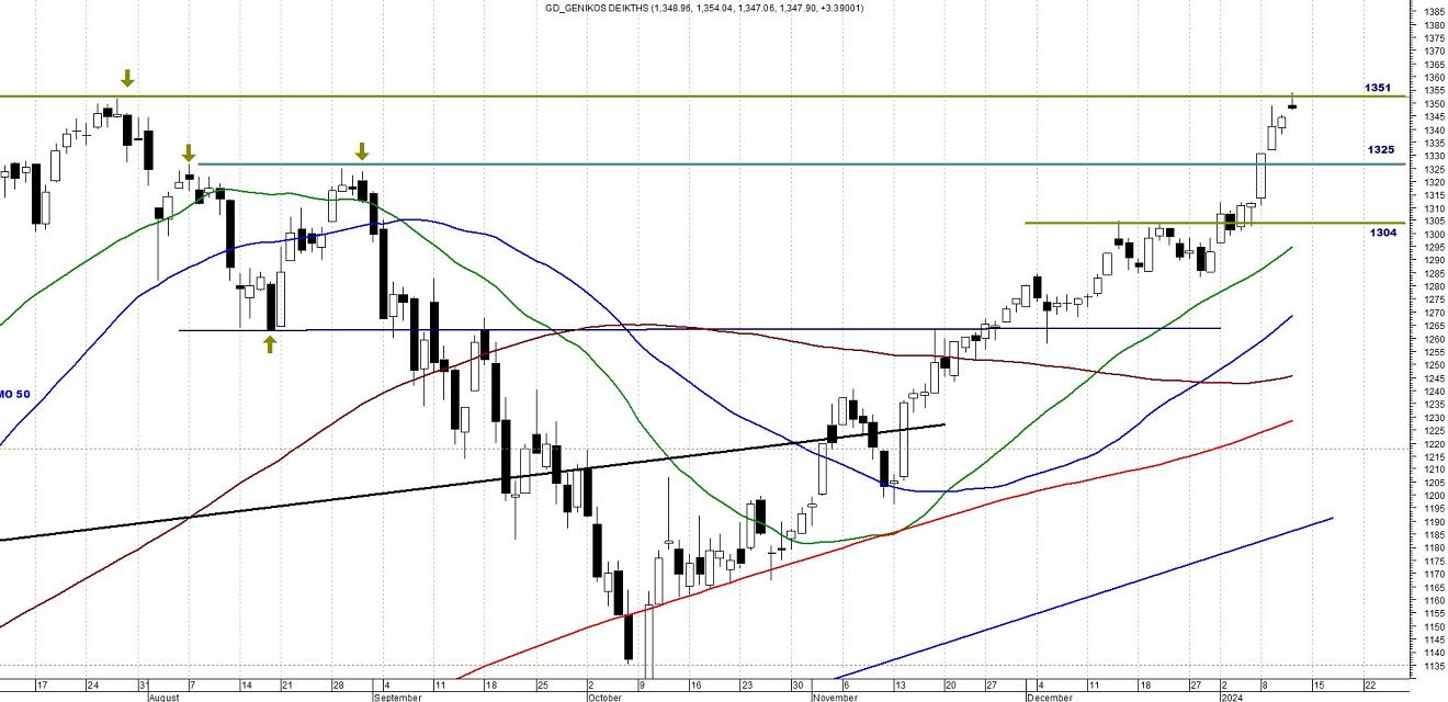 Επόμενος ανοδικός στόχος με κατάκτηση των 1351 μονάδων, είναι οι 1380 μονάδες.