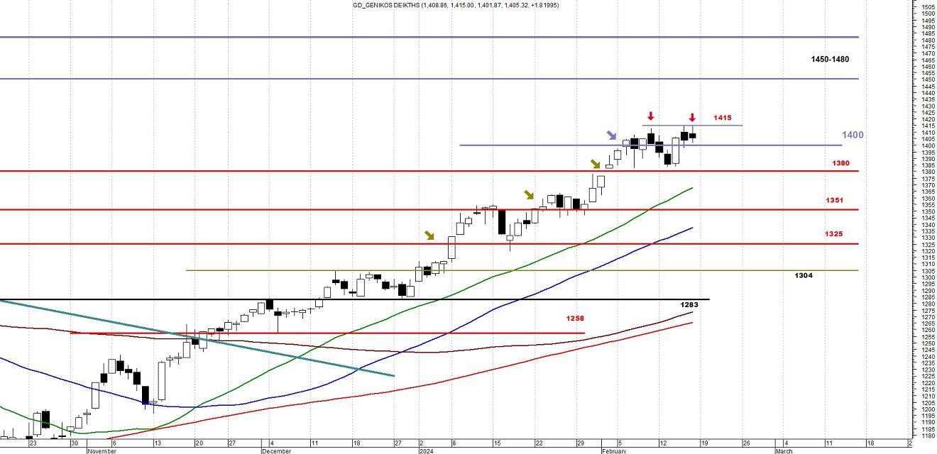 Συνοπτικά θα μπορούσαμε να πούμε ότι παρά την κούραση που παρατηρείται τις τελευταίες μέρες στον ΓΔ, σημάδια έντονων πιέσεων δεν έχουν φανεί ακόμα. Στο μοτίβο αυτό λοιπόν, περιμένουμε την εξέλιξη της κίνησης εντός της ζώνης 1380-1415, για να πάρουμε και την ανάλογη θέση.