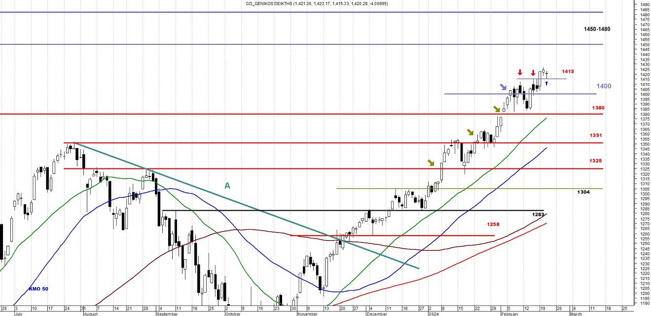Ο ΓΔ με κινήσεις ακριβείας, μας έδειξε ότι το επίπεδο αντίστασης των 1415 μονάδων που μας ταλαιπώρησε περίπου 2 εβδομάδες, μετατρέπεται πλέον σε επίπεδο στήριξης.