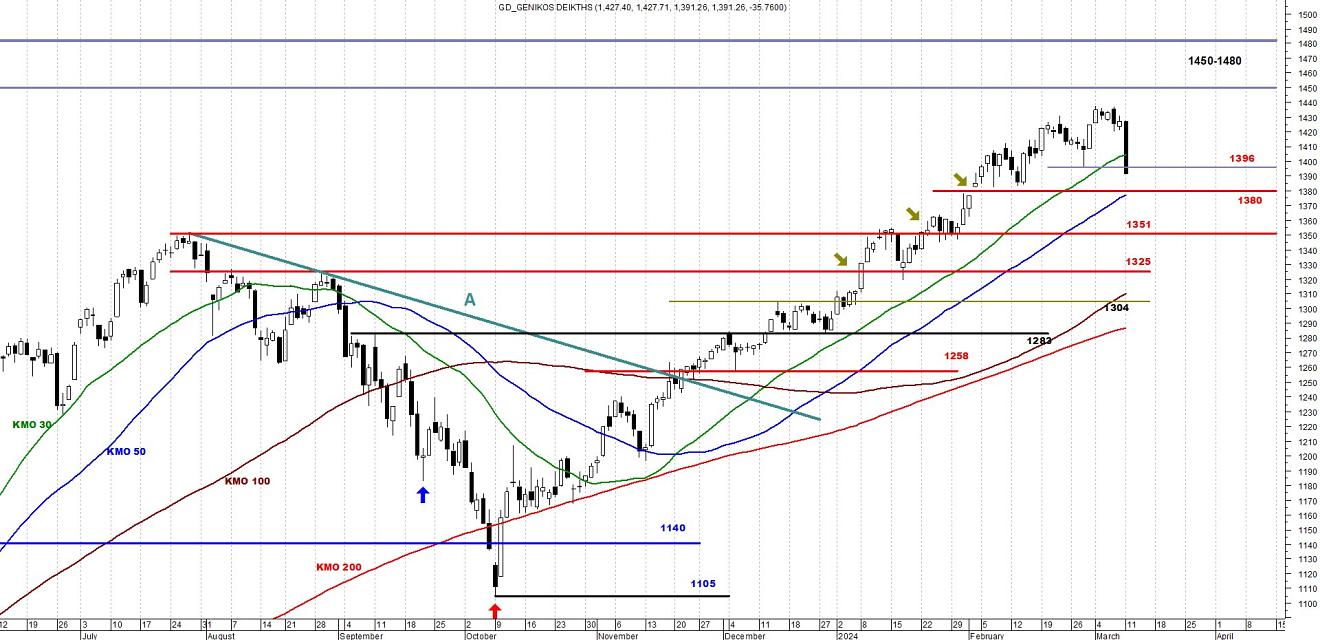 Πρώτο σημαντικό όριο στήριξης βρίσκουμε πέριξ των 1380 μονάδων, επίπεδο το οποίο αν διασπαστεί πτωτικά σε ημερήσια κλεισίματα, θα μας οδηγήσει στο μεγάλο και σοβαρό όριο στήριξης των 1350 μονάδων.