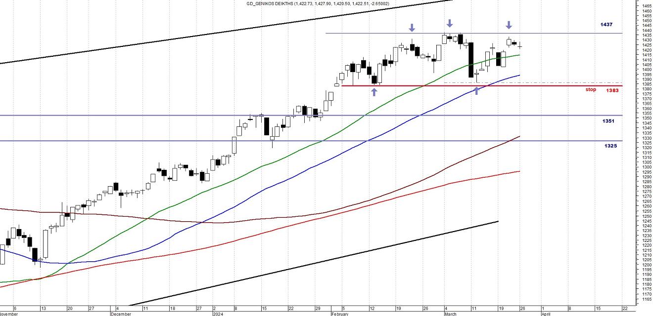 Ο ΓΔ συνεχίζει να εκτελεί την κίνηση ανάμεσα στις 1380-1430 μονάδες, χωρίς να δείχνει σημάδια απεμπλοκής από την συγκεκριμένη ζώνη.