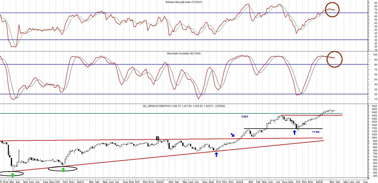 Επίσης η ανοδική υπέρβαση των 1430 μονάδων και ειδικότερα των 1437 μονάδων σε ημερήσιο κλείσιμο, θα ενεργοποιήσουμε επίσης νέα αγοραστικά σήματα..