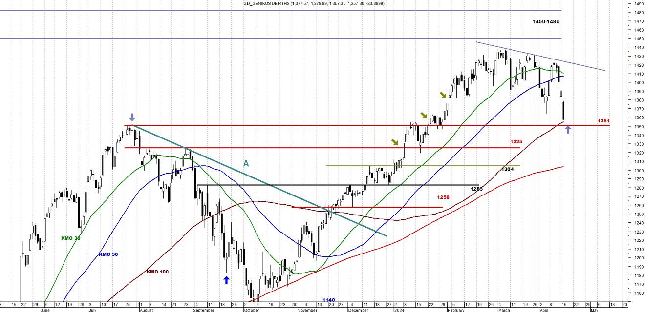 Πέριξ των 1330 θα προσπαθήσει το ελληνικό χρηματιστήριο, αν χάσει βέβαια τις 1351 μονάδες πρώτα, να βρει το επόμενο επίπεδο ασφαλείας και στήριξης, όπως μπορούμε να δούμε στο παρακάτω γράφημα
