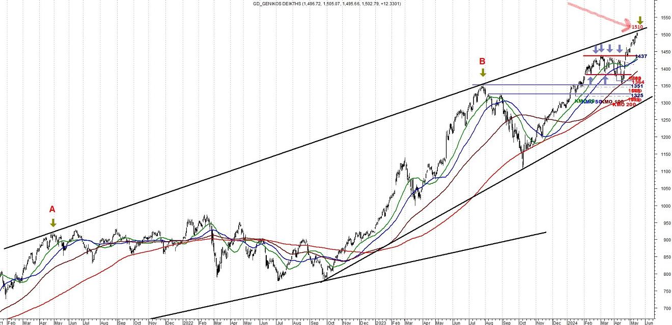 Στην παρούσα φάση ο ΓΔ θα συναντήσει την πρώτη του σοβαρή αντίσταση πέριξ των 1510 μονάδων, όπως μπορούμε να δούμε στο παρακάτω γράφημα