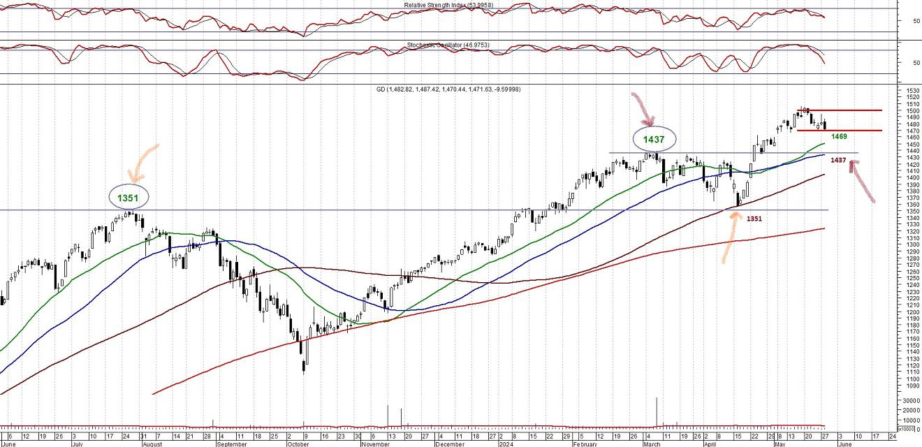 β) η περιοχή των 1430-1440 μονάδων, όπου θα μας ξεκαθαρίσει αν η μεσοπρόθεσμη ανοδική κίνηση θα χάσει την ορμή της ή θα συνεχίσει το ανοδικό της κυματισμό και θα μας οδηγήσει ξανά πάνω από τις 1500 μονάδες.