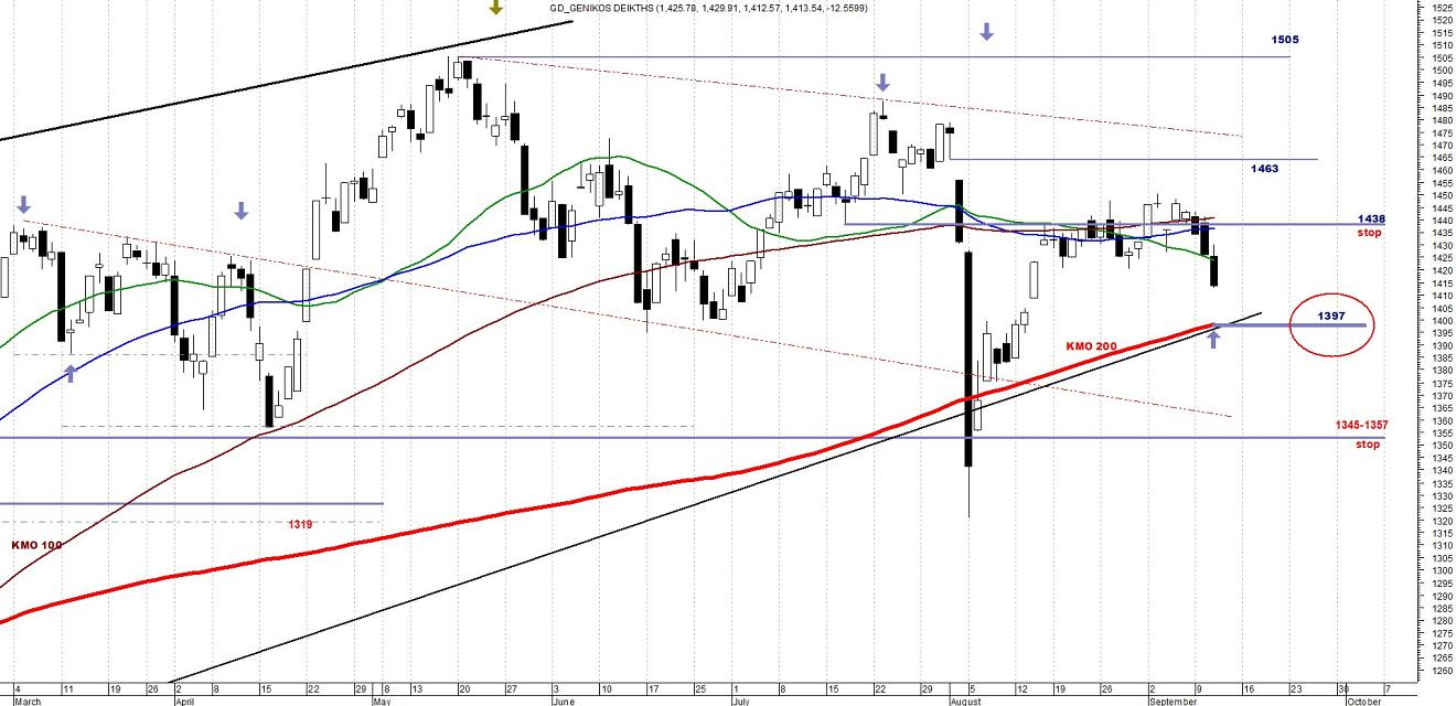 Το γύρισμα που κάνει τώρα ο ΓΔ προς τις 1400 μονάδες, φαίνεται να βρίσκεται στο τελικό στάδιο εκτόνωσης του. Τις επόμενες συνεδριάσεις θα πρέπει να δούμε σοβαρή προσπάθεια ανοδικής εκκίνησης με τζίρο πάνω από τα 100 εκ. ευρώ, για να μπορούμε να πούμε ότι θα αποφύγουμε την κατρακύλα κάτω από τις 1400 μονάδες.