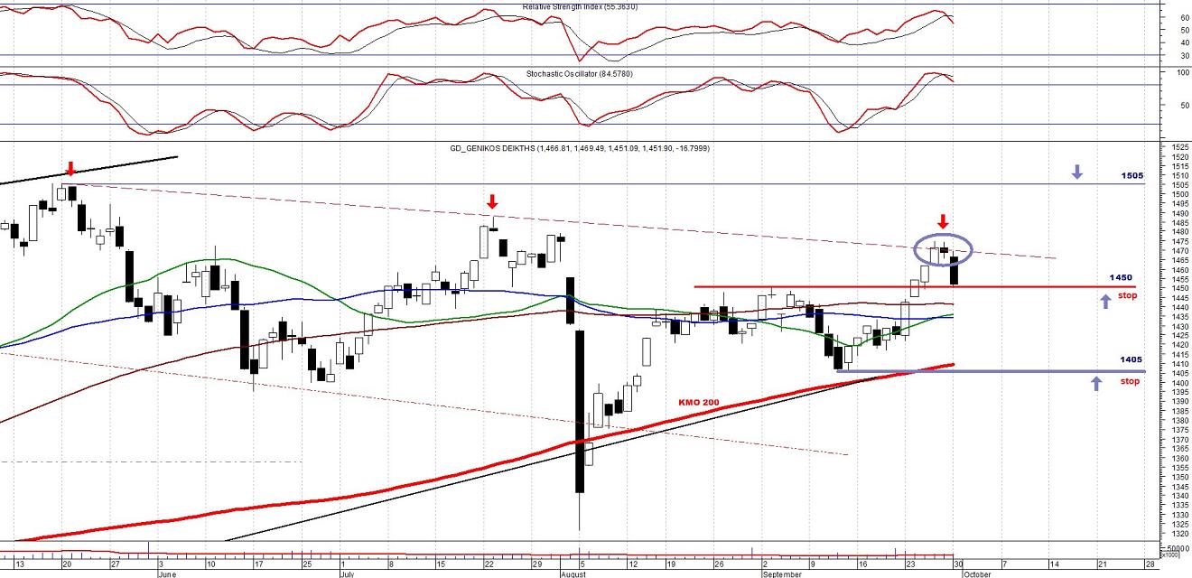 Στην περίπτωση που ο ΓΔ θελήσει να κινηθεί ανοδικά, θα πρέπει το αργότερο έως το κλείσιμο, να έχει κρατηθεί πάνω από το 1450 και στο καλύτερο σενάριο να αναρριχηθεί προς τις 1460-1470 μονάδες. Μια πιθανή ανοδική διάσπαση της κατερχόμενης γραμμής τάσης που ενώνει τις προηγούμενες κορυφές, θα σηματοδοτήσει μια νέα προσπάθεια για προσέγγιση των 1500-1505 μονάδων.