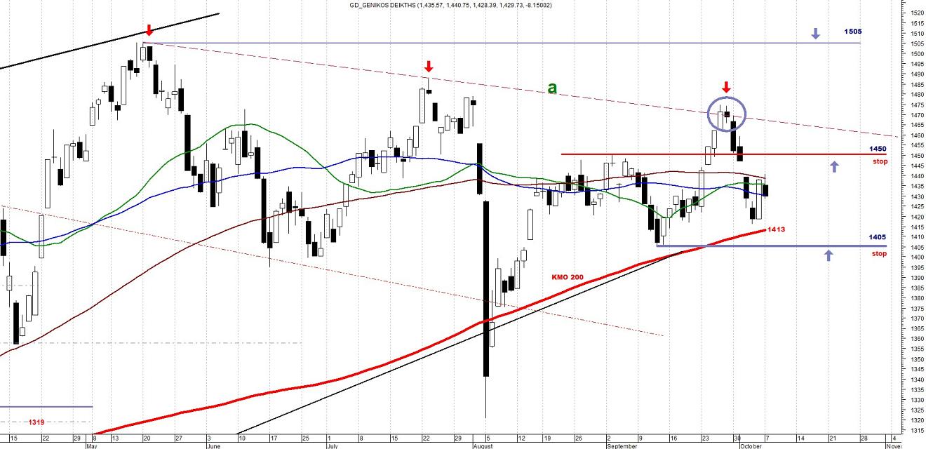 Για να αποφύγουμε πιθανή πτωτική ταλαιπωρία, θα πρέπει άμεσα ο ΓΔ να βρεθεί τόσο πάνω από τις 1450 μονάδες, όσο και πάνω από την γραμμή τάσης a, η οποία για την ώρα λειτουργεί σαν σοβαρή αντίσταση.