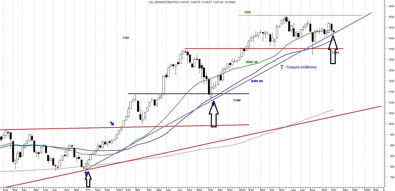 Τις επόμενες 2 εβδομάδες θα πρέπει το ελληνικό χρηματιστήριο να αποφασίσει αν θα κάνει την κίνηση υπέρβασης προς τις 1505 μονάδες και πάνω, ή θα δούμε καθοδική τμήση της γραμμής ανάβασης Τ, σηματοδοτώντας μια νέα εποχή αναζήτησης χαμηλότερων επιπέδων.