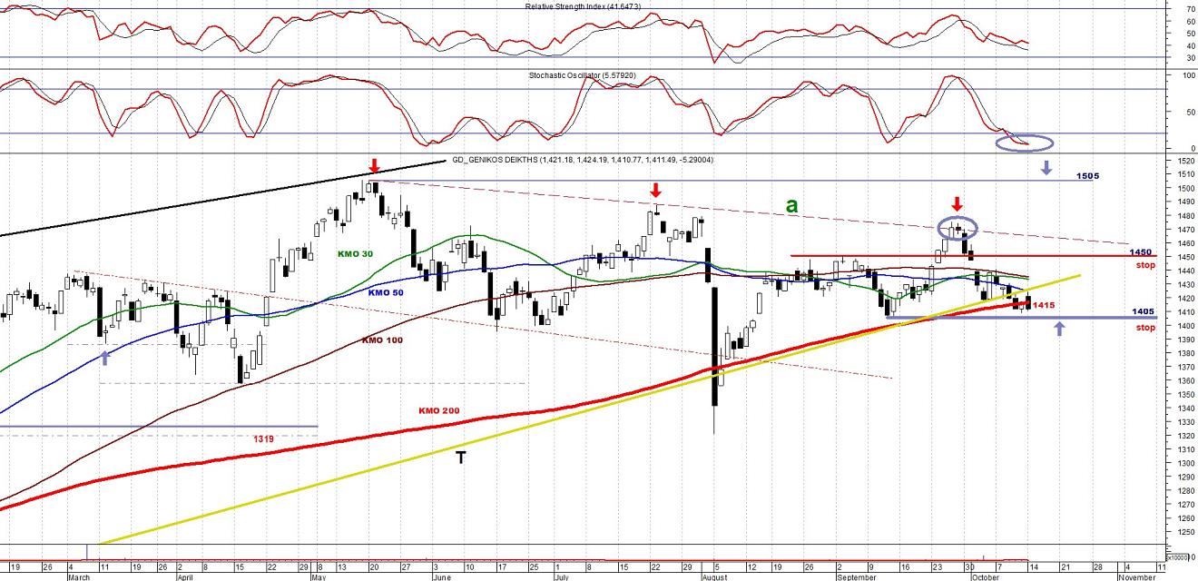 Στο πρώτο γράφημα μπορούμε να δούμε τον ΓΔ να παλεύει τόσο με τον ΚΜΟ-200 ημερών στις 1416 μονάδες, όσο και με την τελευταία στήριξη των 1405 μονάδων.