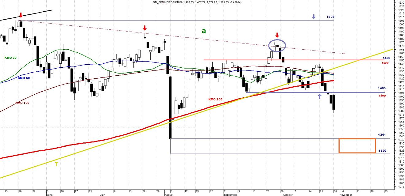 H προσπάθεια που έγινε τις 2 τελευταίες μέρες για ανοδική υπέρβαση των 1405 μονάδων, δεν είχε αποτέλεσμα, με συνέπεια οι 1405 μονάδες να αποτελούν πλέον επιβεβαιωμένη περιοχή αντίστασης.
