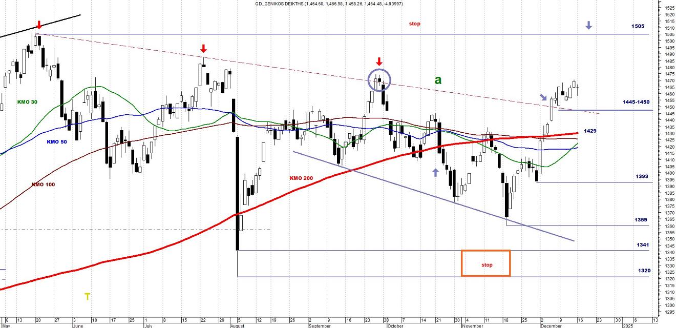 Η γραμμή κατάβασης a, που μας είχε ταλαιπωρήσει για αρκετούς μήνες, φαίνεται ότι πάει να διασπαστεί ανοδικά. Η επιστροφή του ΓΔ στα επίπεδα των 1445-1450 μονάδων, θα μας δείξει αν υπάρχουν ελπίδες για δημιουργία στηρίξεων στα επίπεδα αυτά και συνέχιση της ανοδικής τάσης προς τις 1500 μονάδες.