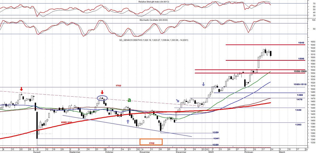 Για να αποδειχθούν αυτά τα σήματα ισχυρά και να δούμε αλλαγή της μεσοπρόθεσμης τάσης σε πτωτική, θα πρέπει ο ΓΔ να κατέβει κάτω από το ψυχολογικό όριο των 1590-1600 μονάδων.