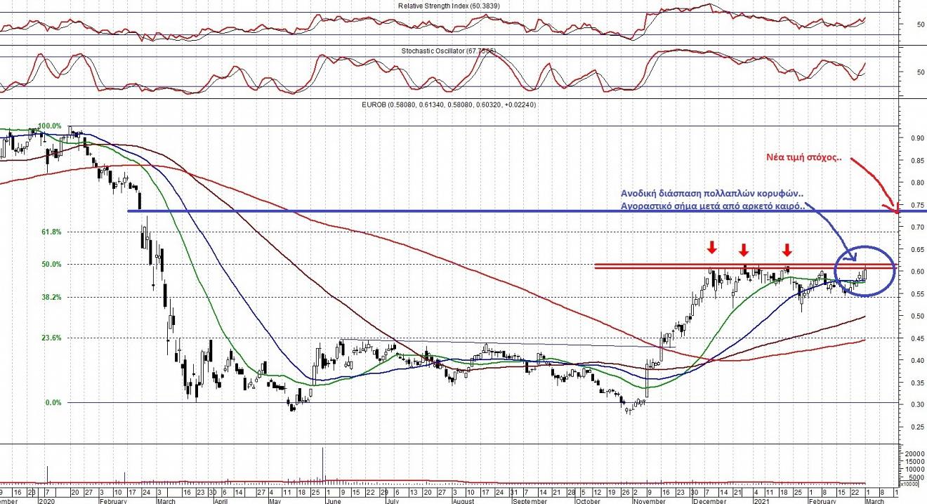 Χρειάστηκαν περίπου 3 μήνες συσσώρευσης για την μετοχή της Eurobank για να καταφέρει να φύγει ανοδικά πάνω από την "τυραννική" περιοχή των 0,60-0,61 ευρώ.