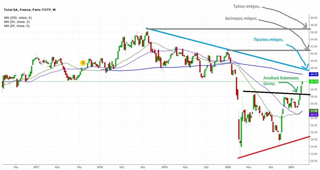Διαγραμματικά η μετοχή έχει διαφύγει ανοδικά της ζώνης συσσώρευσης των τελευταίων μηνών, όπως μπορούμε να δούμε στο παρακάτω εβδομαδιαίο γράφημα