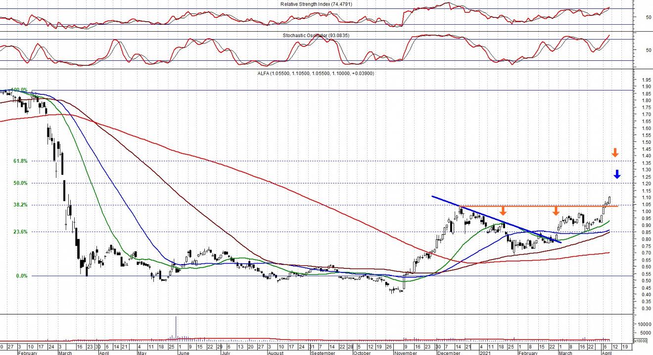 Ακολουθώντας το σωστό βηματισμό πλέον, η η μετοχή της ΑΛΦΑ οδηγείται προς την πρώτη αντίσταση των 1,20 ευρώ..