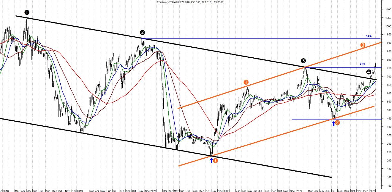 Η κίνηση πάνω από τις 752 μονάδες αλλάζει τα δεδομένα στον τραπεζικό δείκτη, μαζί με την ταυτόχρονη έξοδο από το μακροχρόνιο πτωτικό κανάλι που μπορούμε να δούμε στο παραπάνω γράφημα, ισχυροποιώντας τη μακροχρόνια ανοδική τάση.