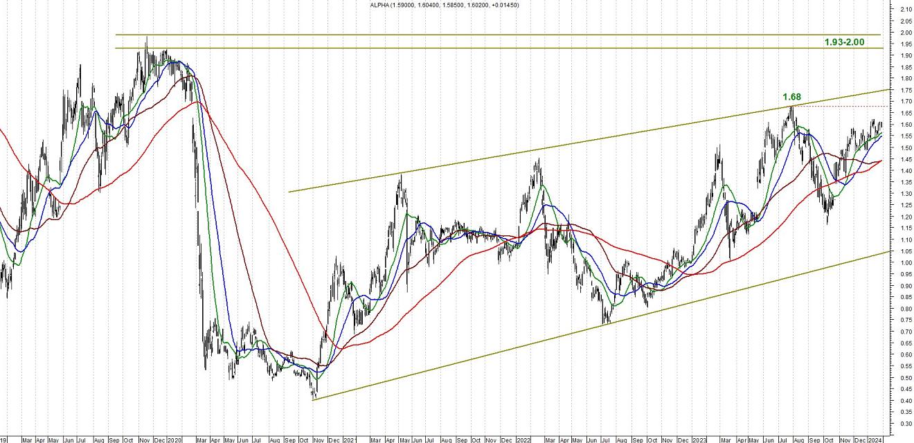 Όπως μπορούμε να δούμε, η μετοχή κινείται εντός του μεγάλου μακροχρόνιου καναλιού, με πιθανή εξάντληση της υφιστάμενης ανοδικής της ορμής κοντά στο 1,75.